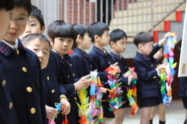 理事長先生と校長先生のお話を一生懸命に聞きました。