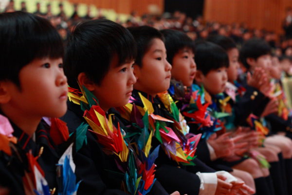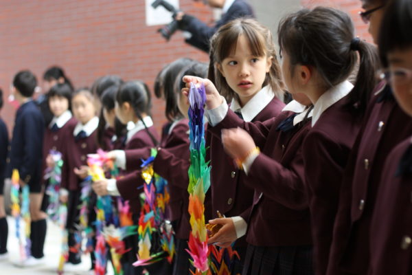 折り鶴で作った首飾りを持って新入生を迎える2年生たち