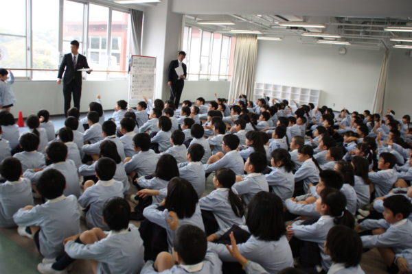 1年生も途中から通学集会に合流し、2年生以上のお兄さん・お姉さんとともに登下校時に気を付けないといけないことを学習しました。