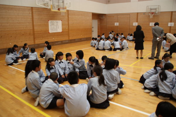 まず、2~6年生がアリーナⅡに集合し、登下校時の通学マナーについて全体的な諸注意を聞きました。