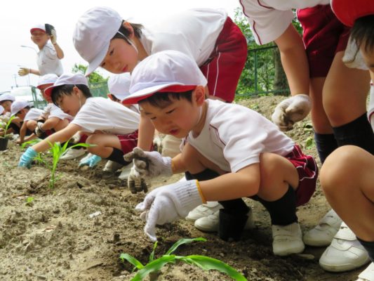 爽やかな気候の中、子どもたちは、「大きくなーれ」「元気に育ってね」と声をかけて、優しく苗を植えていました。大きなトウモロコシが実ることをとても楽しみにしていました。