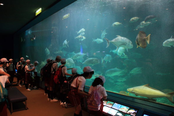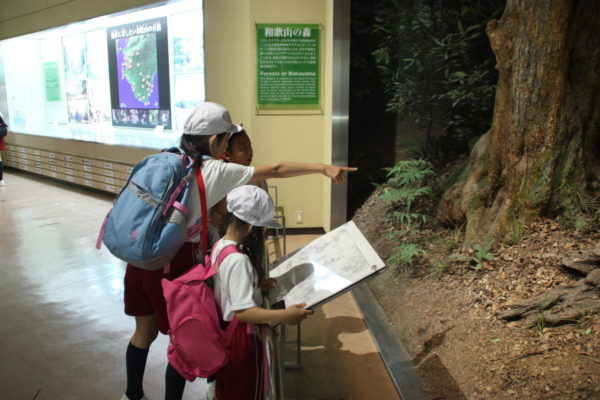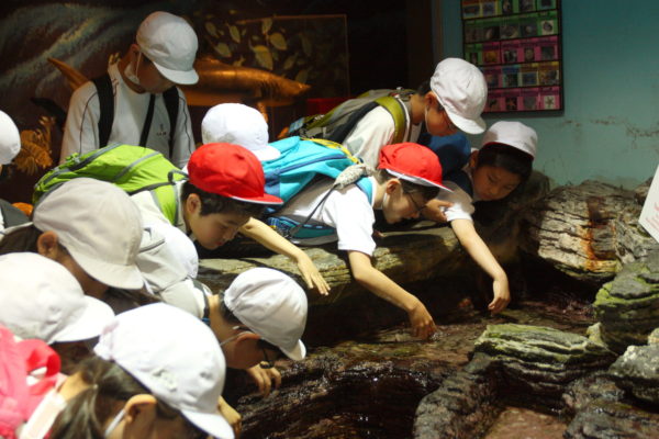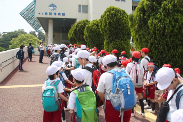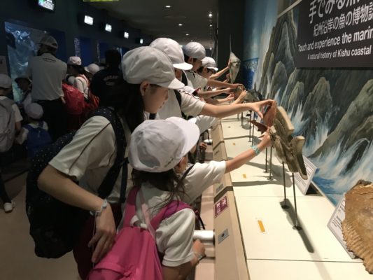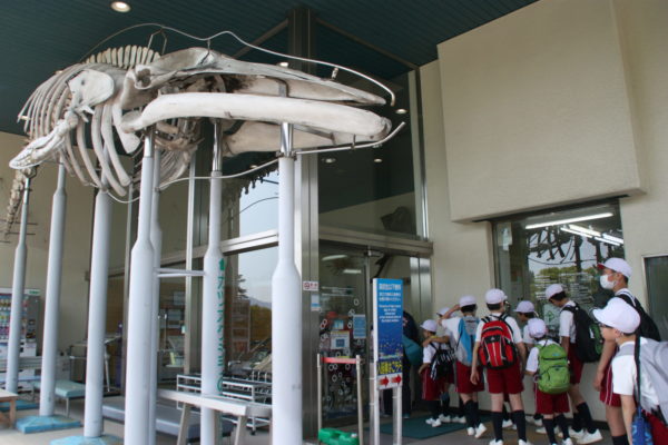 まずは、県立自然博物館に到着。バスを降りて、6年生が1年生の手をしっかりと握り、施設内の展示を見学しました。大きな魚から小さな貝まで、たくさんの種類の海の生き物を見ることができました。また、施設内の触れる展示スペースでは、手にとってさまざまなことを感じながら学びました。
