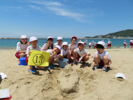 午前の砂の造形アートでは、考えてきた作品を作るために持ち寄った道具も駆使しながら、アイディアも出し合ってすてきな作品を造ることができました。