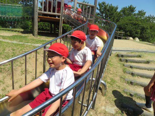 午後からの公園遊びでは、仲良くなった5年生と一緒に、遊具遊びや芝遊びを汗だくになるほど全力で楽しみました。