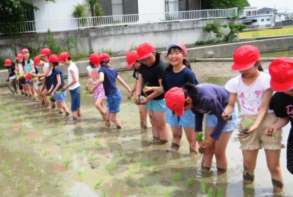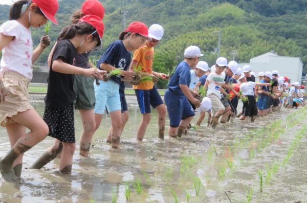 田んぼに入るときは、おそるおそるだった子ども達も、少しずつ慣れてきたようで、最後はみんなどろんこになりながら一生懸命に苗を植えていました。