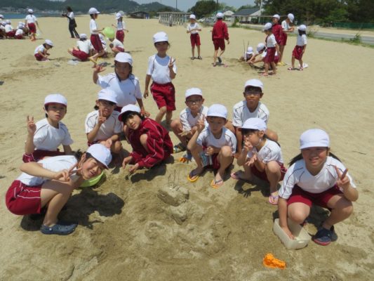 班に分かれ、事前に話し合った砂の造形アートを、2・5年生で協力して作りました。