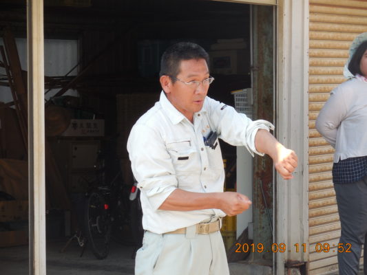岡本様 「鎌をこう入れて刈るんですよ。」 |