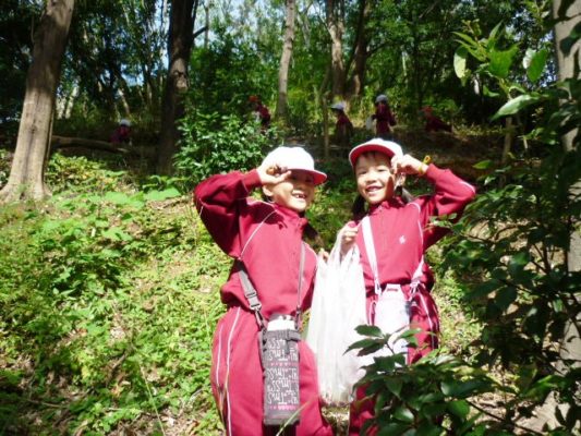 最初に園内の自然の中で秋探しをしました。山の斜面に隠れていたどんぐりや木の実、枝や落ち葉などを子どもたちはたくさん見つけました。