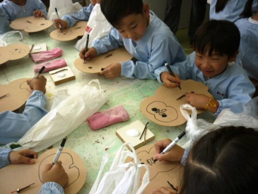 午後からは、時計作りに挑戦しました。下絵の上に拾った木の実や落ち葉、枝を飾り付けて、個性あふれるすてきな作品が出来上がりましたので、わんぱく公園の職員さんも「個性的でみんな上手だね」と褒めていただきました。