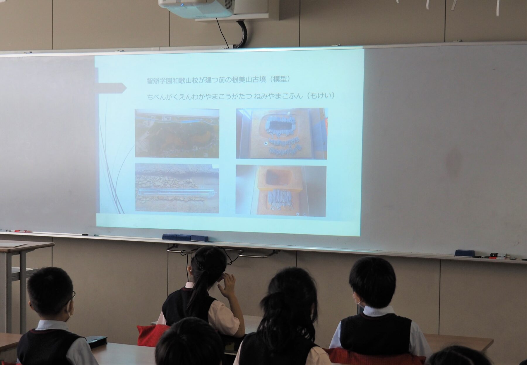 動画では、小学校が建てられる以前の根美山古墳群の説明があり、自分たちが通っている学校が歴史のある神聖な場所に建てられていることを学びました。