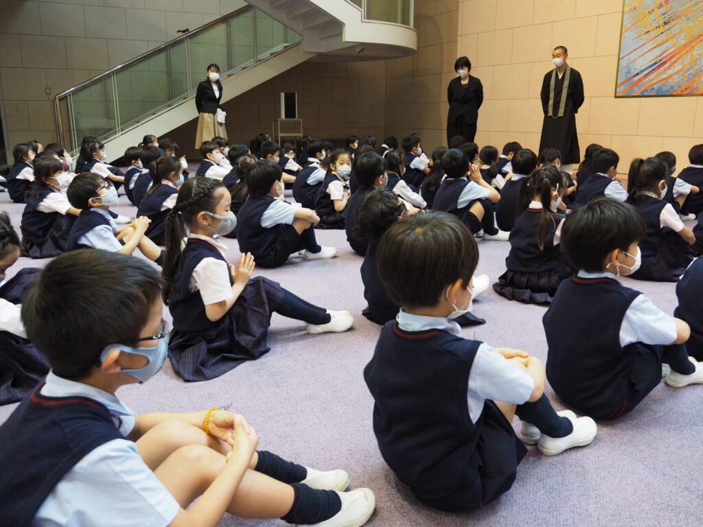 動画視聴後、今年は雨天のため古墳塚には行かず、エントランスホールの曼荼羅の前で遙拝し、宗教担当教員の読経に合わせて心の中でお唱えしました。今月も感謝の気持ちを大切に、一日一日を充実させていきましょう。