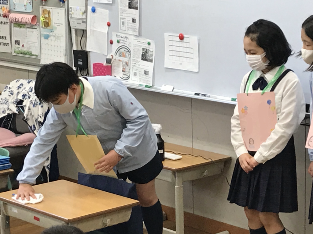 最後に、6年生が1年生のペアの子に家庭科・総合の時間で製作した『ペン立て』と『お手紙』を、サプライズで手渡しました。中には、その場でお手紙を読み始めてくれた子や、大喜びで踊り出す子もいて、非常に嬉しかったです。