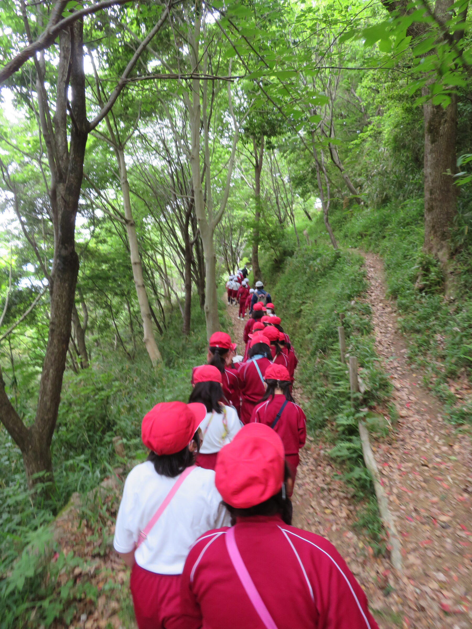 尺取り虫がいたり、カッコウの鳴き声を聞いたり、蛇がいたり、木々の間から遠くの峰を見つけたり。驚きや発見がたくさんあり、緑いっぱいの自然を満喫しました。帰りには、『げんきの森工房』の方のご厚意で、手作りの竹とんぼなどをお土産にいただき、児童たちは大喜びでした。
