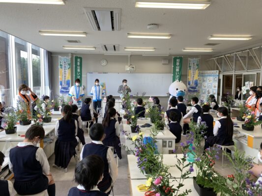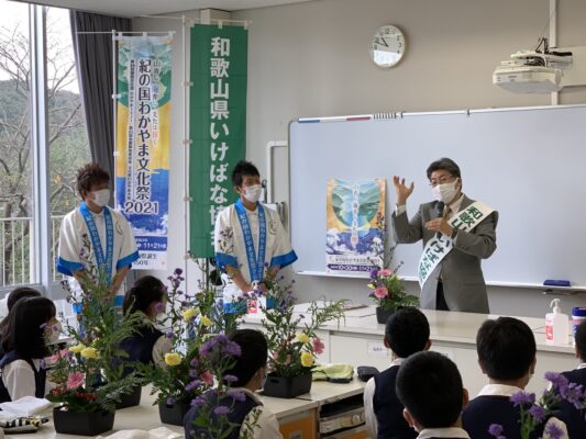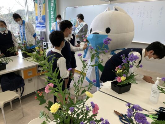 本校には、「和歌山県生け花協会の岡田会長」をはじめ協会員の方々や、お笑い芸人の「すみたに」さん、和歌山県PRキャラクターの「きいちゃん」が来てくれました。生け花作りや、豪華な講師陣・キャラクターが来てくれたおかげもあり、児童一人ひとりが目を輝かせて、夢中で創作していました。