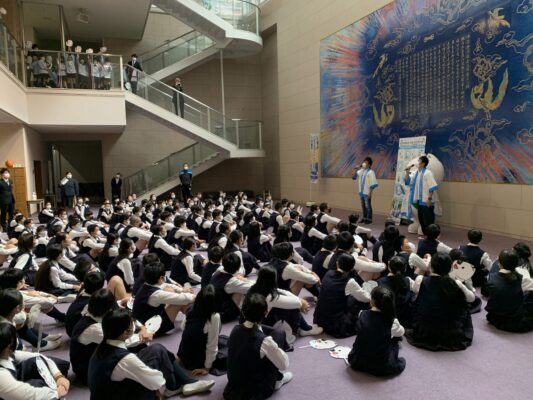 お昼休憩には、エントランスホールにて「紀の国わかやま文化祭 2021」のPRイベントが行われました。5・6年生だけでなく、他の学年の児童も「きいちゃんのうちわ」を持って、螺旋階段や各階のフロアでイベントに参加しました。MCはお笑い芸人の「すみたに」さんが務めてくれて、エントランスホールにいる5・6年生だけでなく、螺旋階段や各階にいる児童たちも盛り上げてくれました。