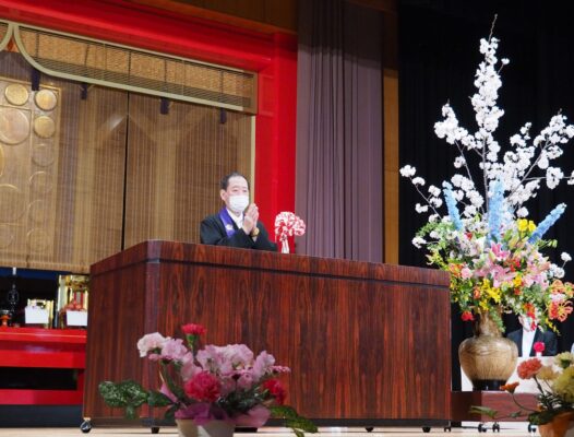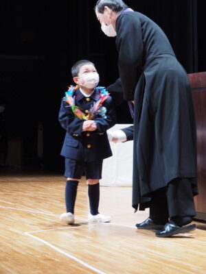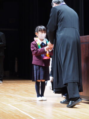 念珠授与で舞台に上がるときには、緊張した様子も見られましたが、理事長先生から 「がんばりましょう。」 と念珠を手渡しされると、 「がんばります!」 と元気な声で返事をし、念珠を受け取ることができました。