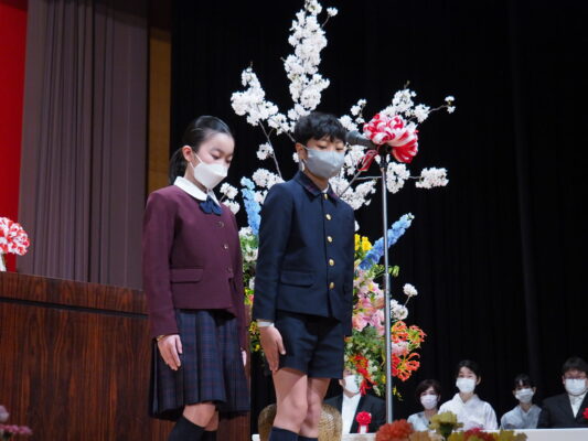 在校生代表として、6年生2名が新入児童に向けて歓迎の言葉を送りました。 さすが6年生、という堂々とした歓迎の言葉を、新入児童も真剣に聞いていました。