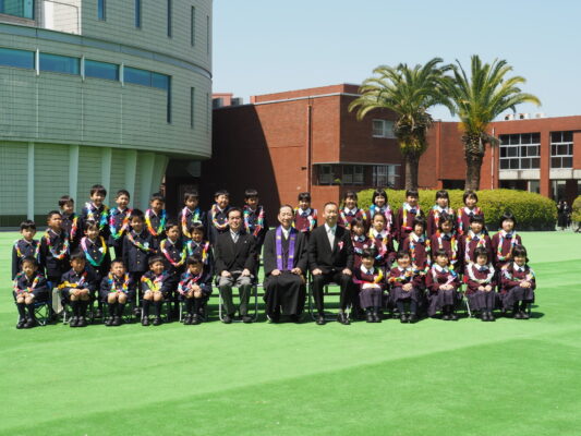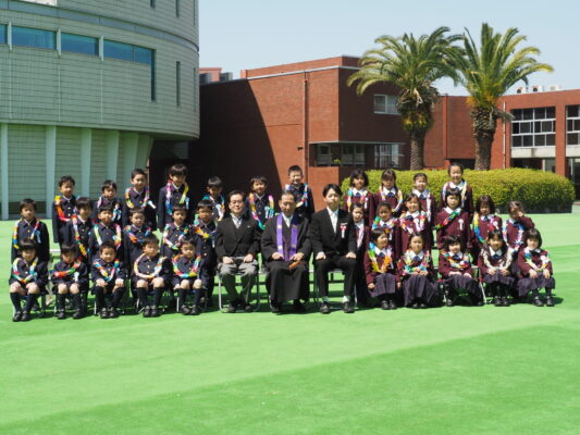 理事長先生や校長先生のお話を一生懸命に聞き、理事長先生から『聞く姿勢が100点満点』と褒めてもらえましたので、みんなにっこり。