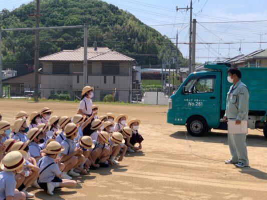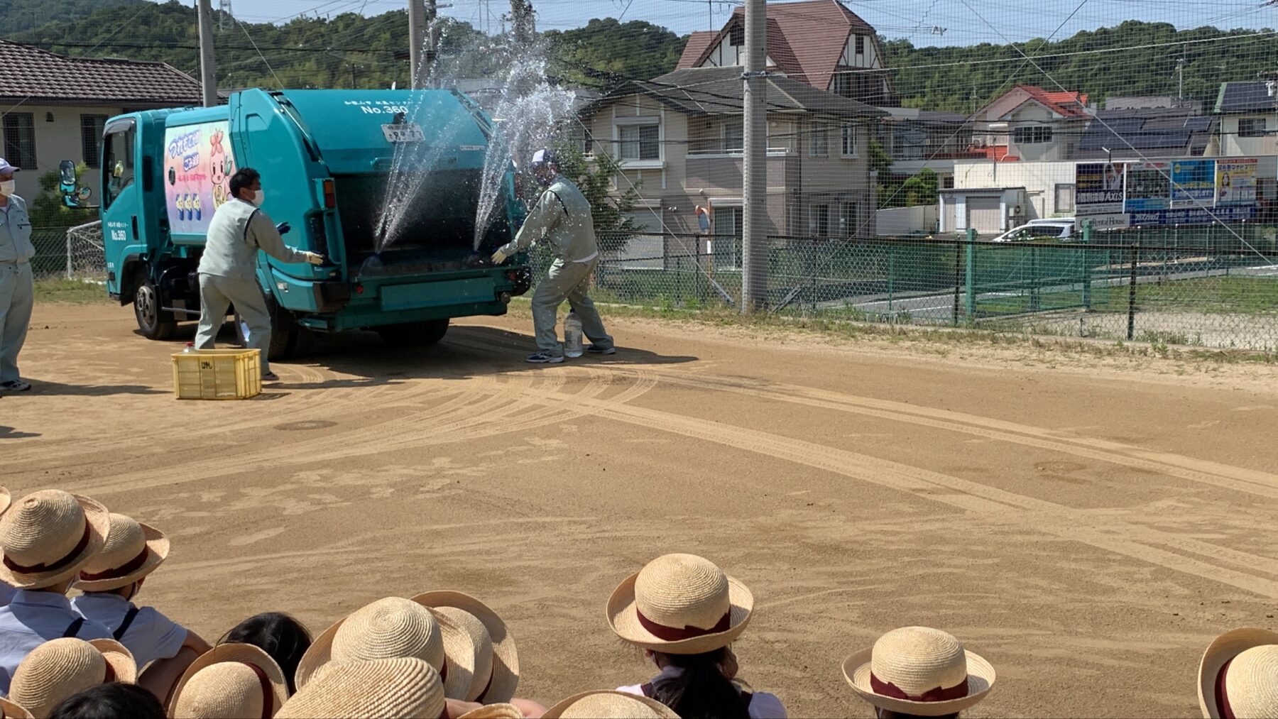 後半は専用グラウンドに移動して、本物のパッカー車(ゴミ収集車)を見せてもらいました。 間近で見るパッカー車に、みんな興味津々! とても貴重な体験ができました!