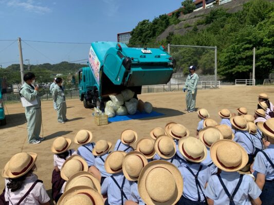 5月9日(木)、3年生の出前授業がありました。 自分たちの暮らしとゴミの関係について学ぶため、和歌山市市民観光局の方々に来ていただき、和歌山市のゴミについてお話していただきました。 自分たちが一日に出しているゴミの量や、和歌山市のゴミの分別について分かりやすく教えてもらいました。