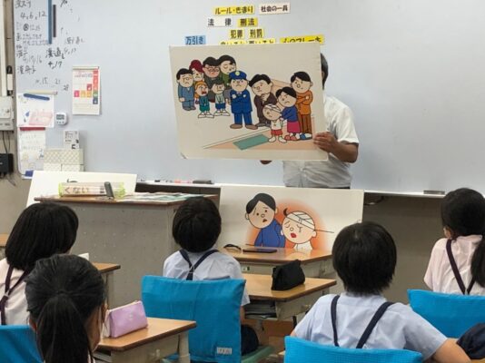 6月20日(月)、和歌山県警和歌山東警察署から特別講師の警察官をお呼びして、キッズサポートスクールが行われました。1限目に2年生、2限目に5年生がお話を聞きました。