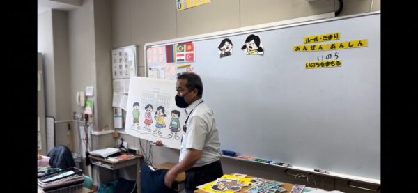 また、帰り道などで知らない人に声をかけられたときにどうするのかについても学ぶことができました。助けの呼び方、きしゅう君の家、110番通報といった方法や、「いかのおすし」といった言葉を大事に、一人ひとりの注意が大切であることを教えてくれました。