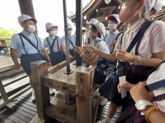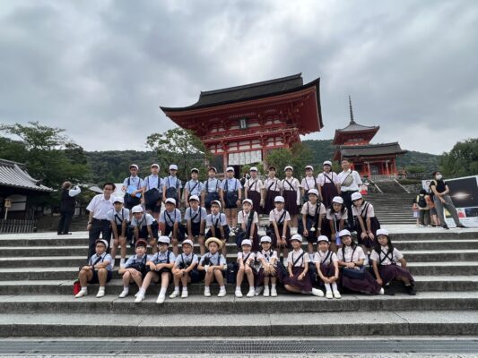 お世話になったあうる京北の方々にお礼を伝え、清水寺へ。パワースポットの音羽の滝で参拝をし、願いを伝えました。また、弁慶が使用したとされる鉄の下駄と96kgある錫杖を一生懸命持ち上げようとしている、子どもたちの姿が見られました。