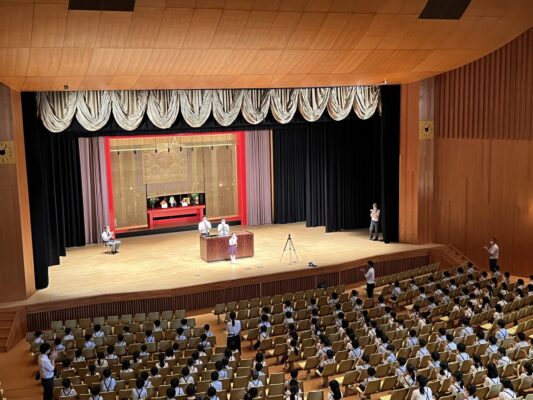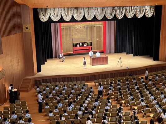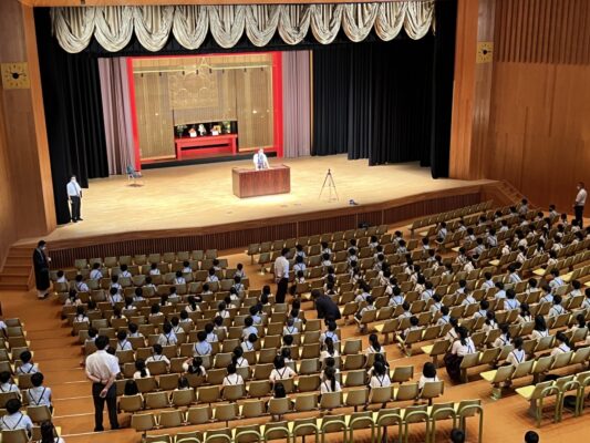 理事長先生のお諭しでは、甲子園での野球部の必勝法についてお話がありました。善い行いをして勝利の女神をつかみ取れば必ず成功するということ、5つのキーポイントを再認識して確かめました。