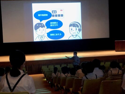 2つ目は、著作権についてです。みんなにとって馴染みのある動画投稿サイトにあるゲームのライブ配信動画を例に話していただき、とても身近な問題だと捉えられたようです。子どもたち一人ひとりが、どうしてゲームのライブ配信動画が著作権違反になる場合があるのかを考えました。誰かの作品や商品を公の場で使用する際には、著作権違反にならないか確認をする必要があることを学びました。