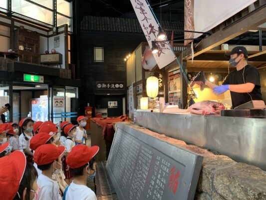 和歌山マリーナシティでは、まぐろの解体ショーを見たり、ワクワクいきものワールドでたくさんの動物とふれあったりしました。