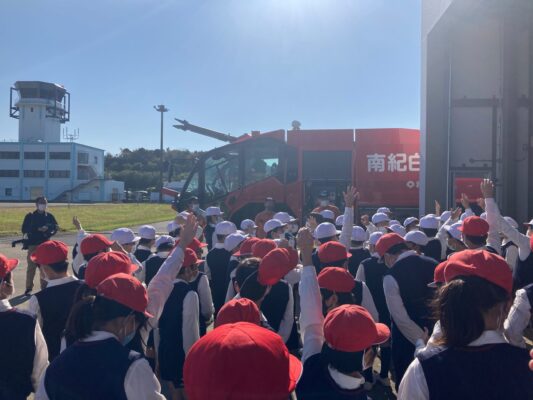 午後からは南紀白浜空港でバックヤードツアーに参加しました。ガイドさんの指示に従い、たくさんの説明を受けながら普段は立ち入ることのできないエリアで色々なことを教えていただきました。特に間近で見る飛行機の離陸は圧巻でした。