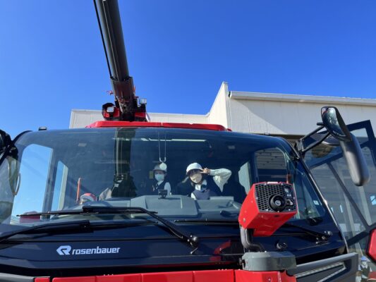 空港専用の大きな消防車、全員が運転席に座るという貴重な経験もさせていただきました。