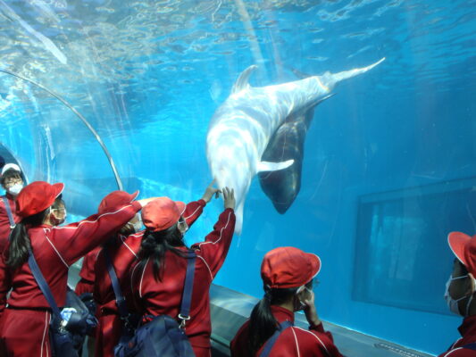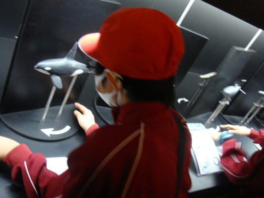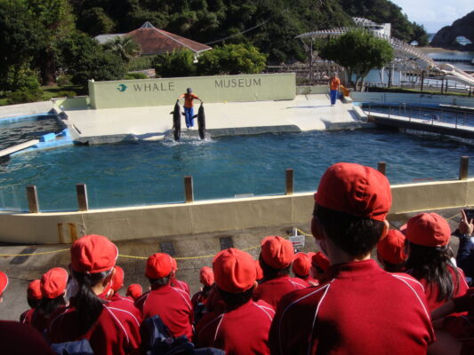 午前中は、太地くじらの博物館に行きました。イルカショーから始まり、クジラショー、博物館見学、くじらの餌やり体験などさまざまな学びができました。イルカを間近で見られ、「かわいー」と皆が大喜びでした。