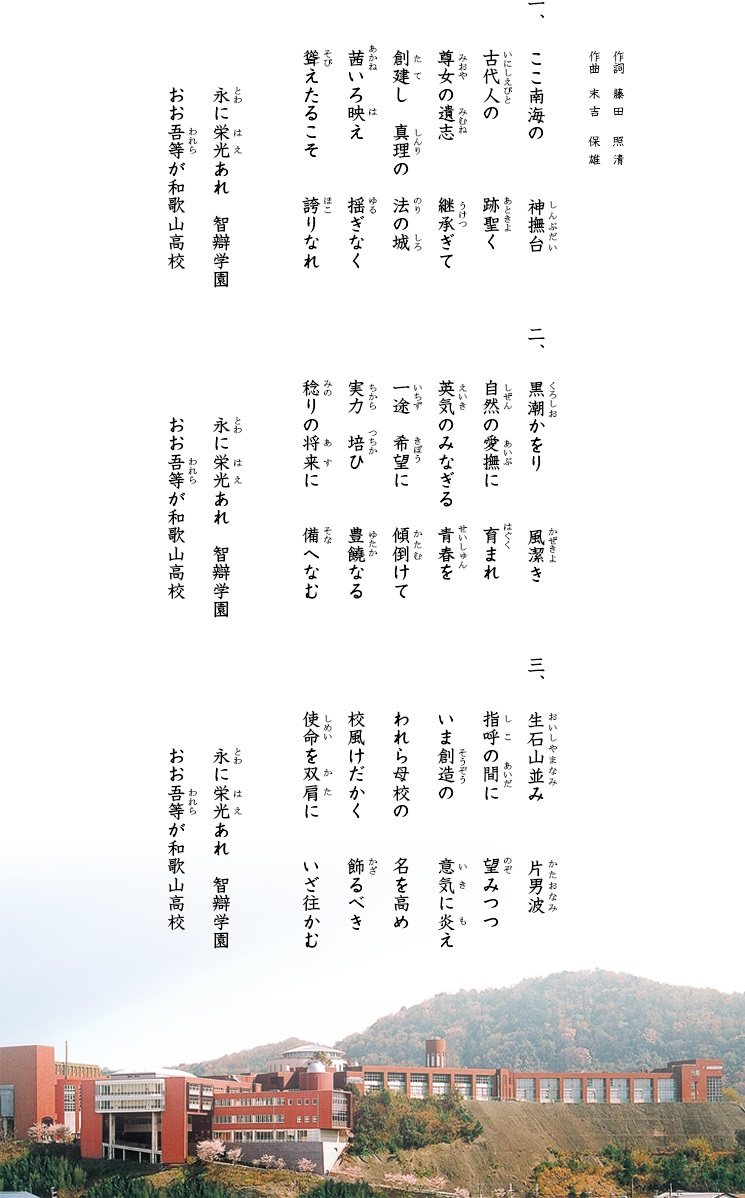 智辯学園和歌山中学・高等学校は、和歌山県当局の強い要請と藤田照清大僧正の私学教育に懸ける熱意とが醸成し、昭和53年4月に開校しました。設立母体は智辯学園中学・高等学校であり、「誠実・明朗」を教育目標とし、持てる能力の最大開発と、人や物を大切にする心、感謝の心、使命感に燃える人間の育成をめざしています。和歌山県が本学園を招致した所以は、本学園玄関壁の碑文「知事招請の辞」に明記されています。本学園は、設立母体の建学の精神を継承し、さらに大きな前進と発展を使命とします。