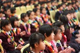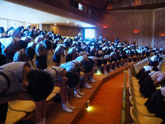 月に一度全校児童・教員が講堂に集まり感謝祭を行います。感謝祭では、四恩に感謝の心を捧げ、読経し、理事長先生からお諭しを賜ります。