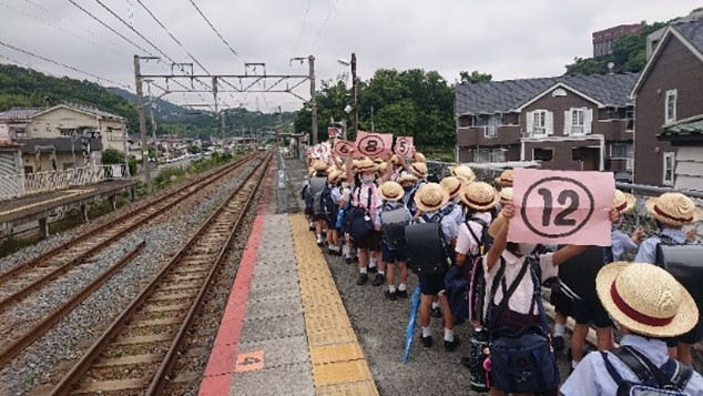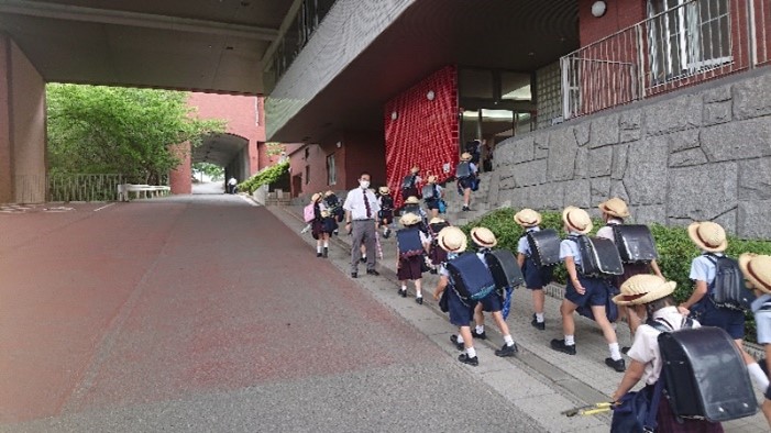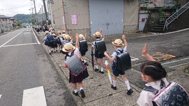 教職員は列の先頭、中間、最後尾と付き添い、自動車や自転車が通過するときの声掛けや、転んだ時のけがの手当てなどを行っています。児童たちも危険な所は自分たちで確認し、自分の命を守るためにどうすべきかを考え、行動しています。