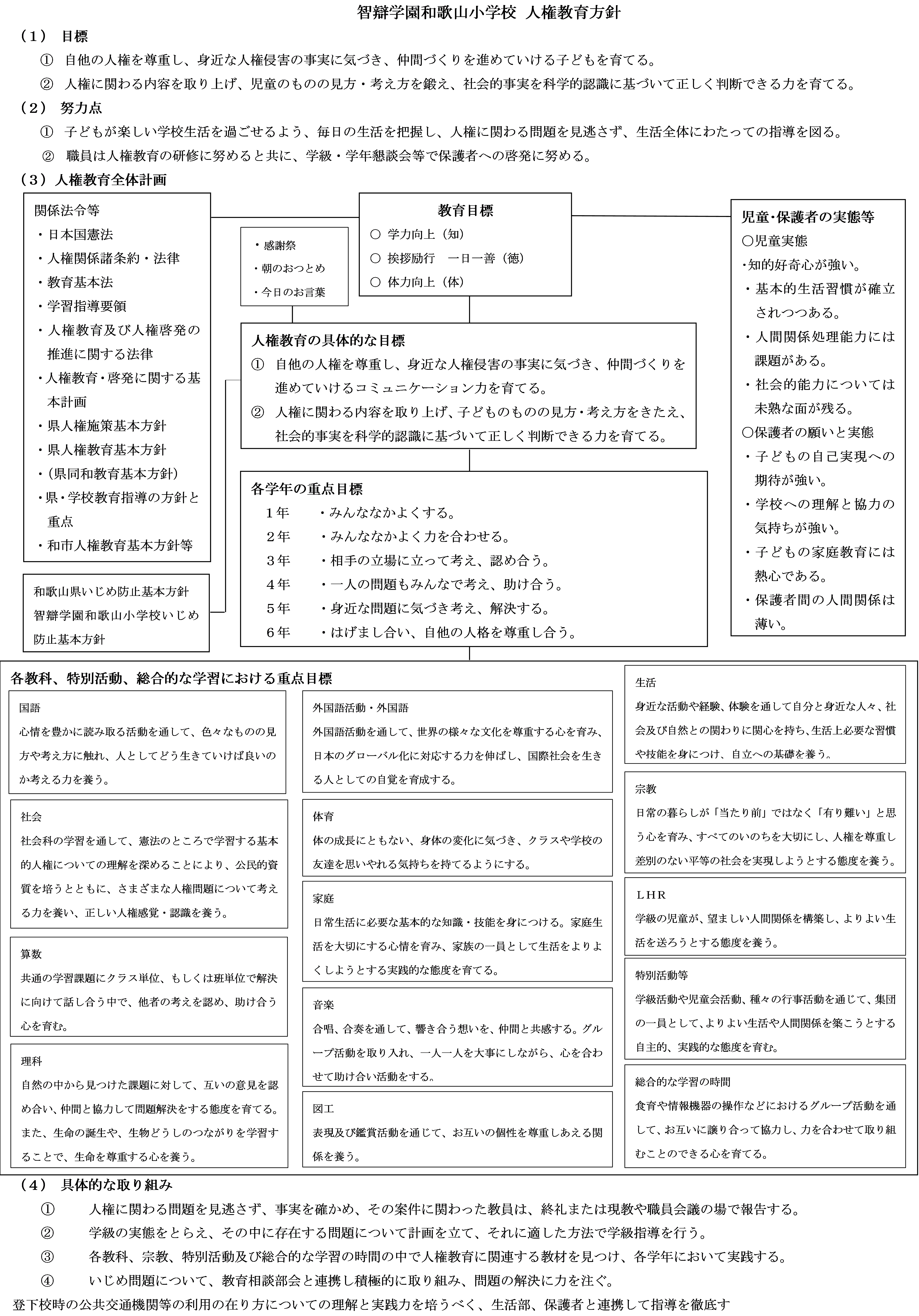 智辯学園和歌山小学校は、小・中・高を見通した教育軸の中で受動的知識の習熟の教育から能動的知識の習熟の教育プログラムを構築し、あわせて、豊かで喜びのある、何事にも意欲的にとりくめる人間性を育むために「こころ」の教育を推進し、十二年一貫教育だからできる教育を通して、のびのび・いきいきと「こどもたちの夢」を育てたい、そのような教育を実践しています。