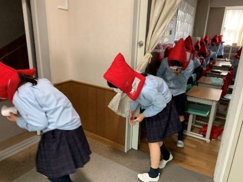 本校では、全校児童が非常時に備え、防災頭巾を各自の座席に常備しています。