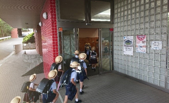 また、正面玄関は自動ドアを設置しており、児童の登校後は防犯上の観点から自動で施錠されます。その他にも、民間の警備会社様と連携し、「いざいう時のために」不審者への対応をしています。これらの取り組みを通して、最大限に「児童の安全・安心」を守る取り組みを行っています。