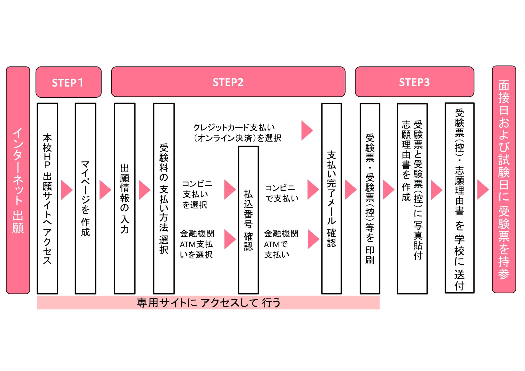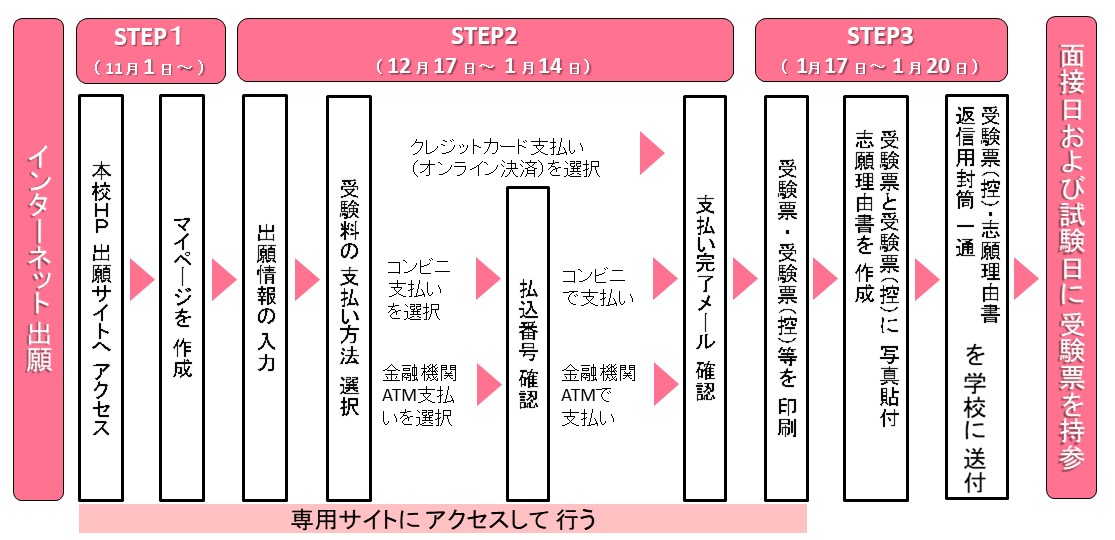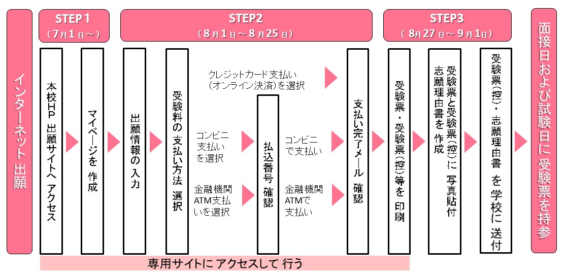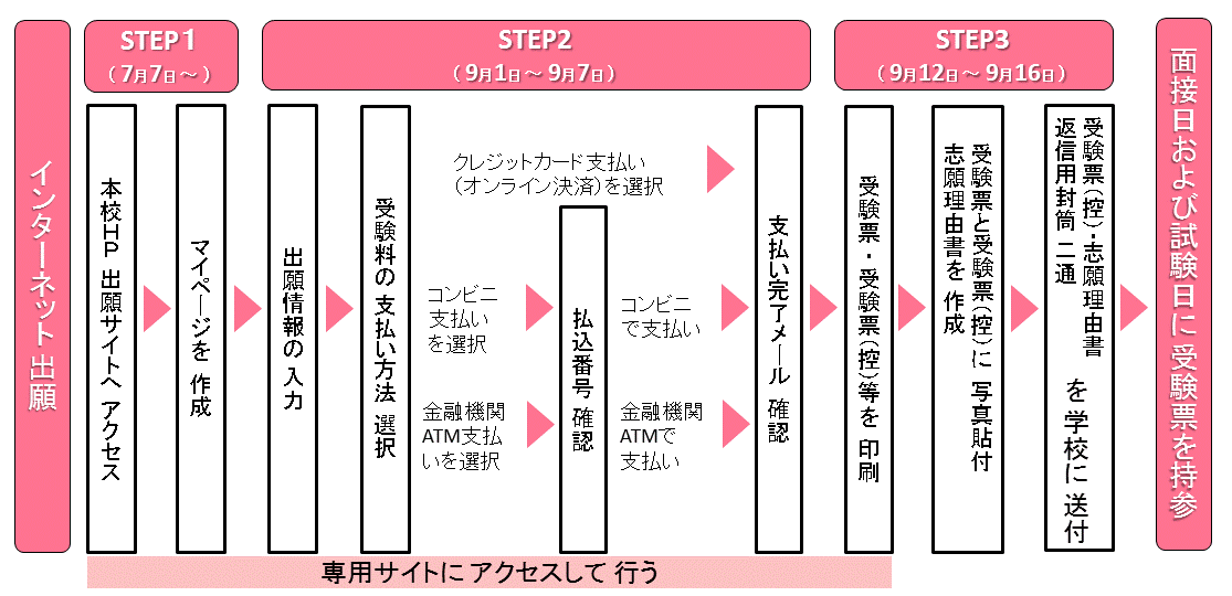 〈手順〉 志願理由書は、いつでもダウンロードもしくは印刷が可能です。 STEP1 本ページ下部にある「インターネットにて出願する」ボタンをクリックしてマイページ登録をする STEP2 出願期間中 STEP3 出願後 |