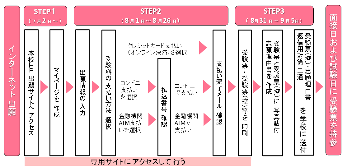 〈方法〉 インターネット出願のみ 〈手順〉 ※ 志願理由書は、いつでもダウンロードもしくは印刷が可能です。 STEP1 7月2日(土)~ 本ページ下部にある「インターネットにて出願する」ボタンをクリックしてマイページ登録をする STEP2 8月1日(月)~ 8月26日(金) STEP3 8月31日(水)~9月5日(月) ☆面接日には面接票と受験票を、入学試験日には受験票を持参する ☆詳しい手順や内容は、ページ下部の「児童募集要項」「インターネット出願の手引き」を必ずご覧ください。 |