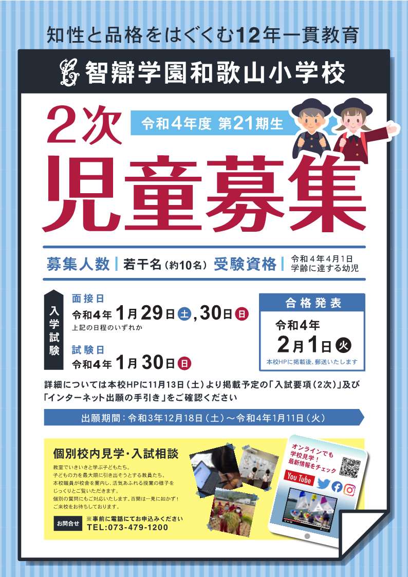 お知らせ 【児童募集】21期生 2次募集のお知らせ 2021年12月28日 2021年12月28日 令和4年度新入生の2次募集を行っております。 出願期間は12月18日(土)~1月11日(火)までです。 入学試験の情報や出願は、下のバナーを押して、詳細ページに進んでください。 また、学校の様子を知りたい方は、出願後でも個別学校見学に参加可能です。 まずは、本校まで電話にてお問合せください。 お問合せ 智辯学園和歌山小学校 073-479-1200 2022年の個別学校見学は、 1月11日(火)より受付します。