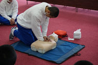 実技ではAEDの使用方法や人形を使った胸骨圧迫や人工呼吸の訓練などを行いました。