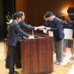 はじめに昨年度の表彰を行いました。昨年度末は和歌山市サッカー新人選手権第2位、平成28年度きのくにジュニア文芸賞ユース短歌の部和歌山県教育委員会賞、第36回全国高校生読書体験記コンクール優良賞、第62回青少年読書感想文和歌山県コンクール最優秀賞、第27回日本数学オリンピックAランク合格、2017ロボカップジュニア関西ブロック大会優勝、第66回高松宮記念杯近江神宮全国競技かるた大会D級3位など多くの生徒たちの活躍がありました。