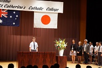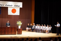 その他 オースラリア留学生来校1日目 2017年9月21日 2017年9月21日 本日、姉妹校であるSt. Catherin’s Catholic Collegeの先生3名、生徒12名が来校し、本校での留学プログラムの初日を過ごしました。 2時間目に講堂にて歓迎式典を執り行いました。学校長、生徒会長の歓迎の挨拶と、SCCCの先生、生徒から訪問の挨拶がありました。その後、本校箏曲部による歓迎演奏を行いました。 学校でのプログラムは明日までとなります。