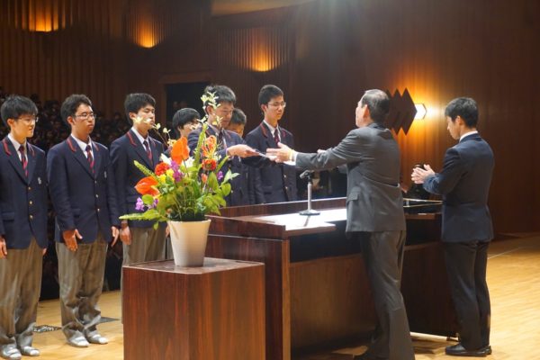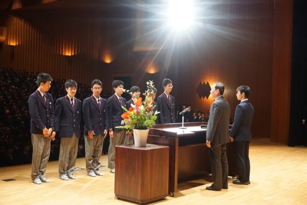 はじめに、3月に埼玉県で行われた第7回科学の甲子園全国大会において、筆記競技で全国2位、実験・工作競技を合わせた総合成績で全国5位に輝いた本校科学部生徒の表彰がありました。