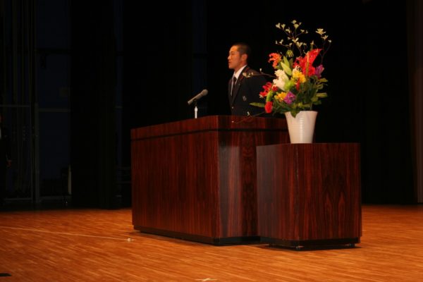 続いて、学校長より訓示があり、選抜大会での野球部の活躍とそれを支えた全校応援のあり様を大学受験になぞらえ、成功を勝ち取るための方法について話をされました。また、新入生に向けて、智辯生として誇りを持って学校生活を送って欲しいと伝えられました。訓示の途中で野球部主将の文元君が登壇し、全校応援に対する感謝と、夏の選手権大会における必勝を宣言してくれました。