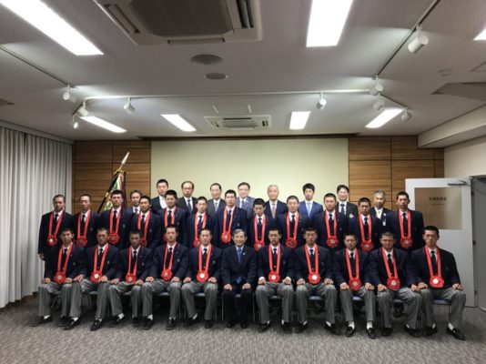 野球 和歌山県庁への表敬訪問 2018年4月13日 2018年4月13日 4月10日(火)野球部が和歌山県庁を表敬訪問し、仁坂知事に選抜大会のお礼や報告を行いました。 始めに本校野球部古宮部長から選手紹介と選抜の報告を行いました。その後、仁坂知事から激励のお言葉を頂きました。 文元主将は、選抜の応援に対するお礼とともに「夏に甲子園の舞台で和歌山県の人たちに感動を与えられるように努力したい。」と抱負を述べました。