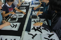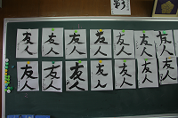 最後は、書道部生徒とペアを組み、書道体験をしました。まず全員に「友人」という字を書いてもらい、その後は好きな言葉を選んで書いてもらいました。