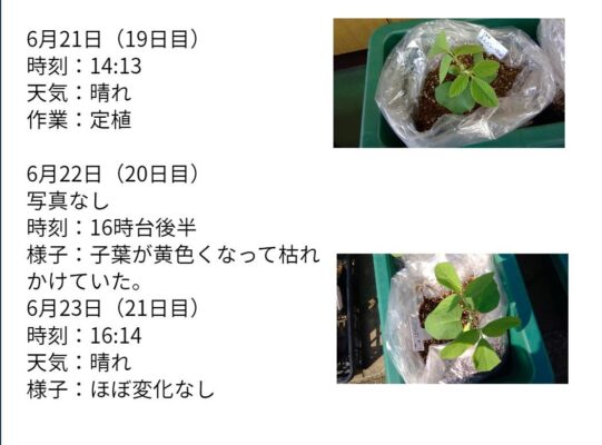 生徒たちは、水やりの間隔・支柱を立てるタイミング・肥料の量などあらゆることを各自インターネットで調べて、栽培に活かしています。日々の記録はロイロノートに書き込み、成長の記録を取ります。